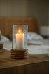 Keep the flame burning even during windy evenings with this beautiful hurricane glass candle stand. It presents itself with a walnut brown base that has a tiered design. You can use it to keep 3" pillar candles or t-lights.